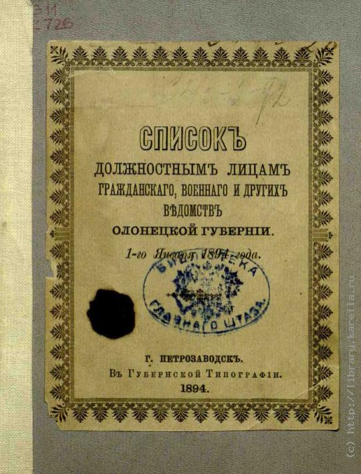 Список должностным лицам гражданского, военного и других ведомств Олонецкой губернии. 1-го января 1894 года. — Петрозаводск : Губернская типография, 1894. — [150] с. — Копии страниц книги в формате jpg. — URL: http://elibrary.petrsu.ru/books/10270 (дата обращения: 05.12.2025)