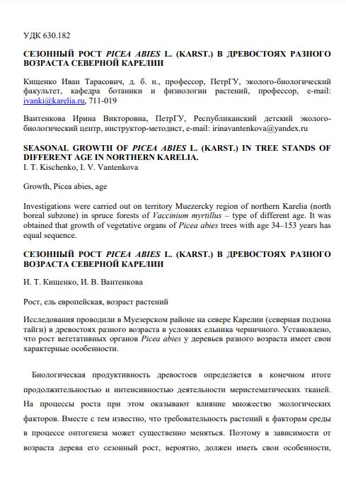 Кищенко И. Т. Сезонный рост Piceae abies L. (Karst) в древостоях разного возраста северной Карелии / И. В. Вантенкова, И. Т. Кищенко // Экологические проблемы Севера : межвуз. сб. науч. тр. — Архангельск, 2005. — Вып. 8. — С.151-153. — URL: http://elibrary.petrsu.ru/books/12395 (дата обращения: 05.12.2025)