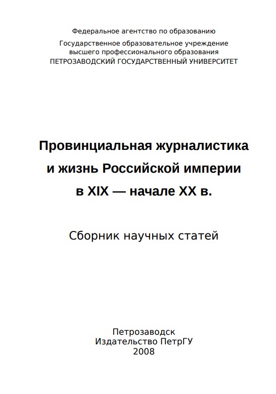 Сборник научных статей «Провинциальная журналистика и жизнь Российской империи в XIX – начале ХХ в.» приурочен к 170-летию начала публикации «Олонецких губернских ведомостей» и посвящен изучению российской провинциальной периодической печати XIX – начала XX в. В первом разделе публикуются статьи, отражающие историю становления и развития провинциальной периодической печати и журналистики в указанный период. Второй раздел сборника посвящен роли местной периодической печати в культурной, научной, политической, социальной и экономической жизни российской провинции и отражению в ней повседневной жизни провинции.