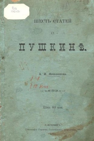 Незеленов А. И. Шесть статей о Пушкине / А. И. Незеленов. — Санкт-Петербург : Типография училища глухонемых, 1892. — [122] с. — Копии страниц книги в формате pdf. — URL: http://elibrary.petrsu.ru/books/14664 (дата обращения: 05.12.2025)