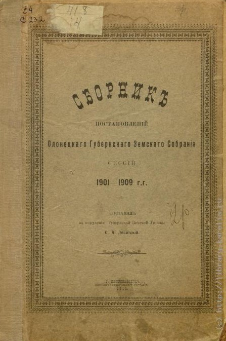Сборник постановлений Олонецкого Губернского Земского Собрания сессий 1901-1909 гг. / Сост. С. А. Левитский. Петрозаводск: Изд. Олонец. губерн. земства, 1910.