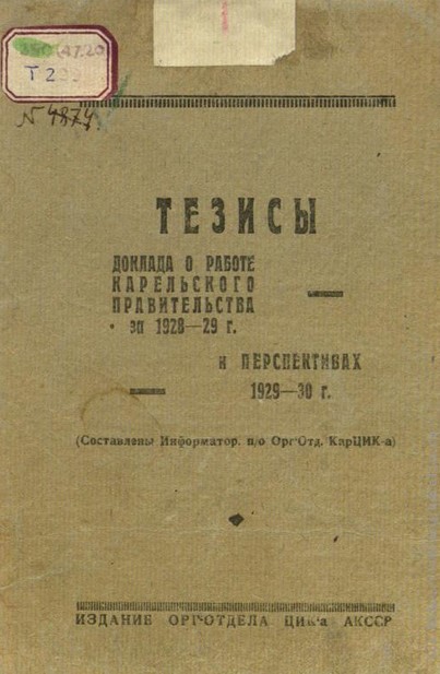Тезисы доклада о работе Карельского правительства за 1928–29 г. и перспективах 1929–30 г. / составлены информатор. п/о Орг. отд. КарЦИКа. — Петрозаводск : Изд. Орготдела ЦИКа АКССР, [1930]. — [37] с. — Копии страниц книги в формате jpg. — URL: http://elibrary.petrsu.ru/books/17340 (дата обращения: 05.12.2025)