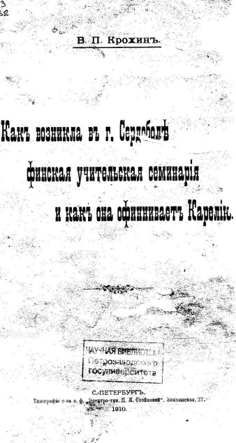 Крохин В. П. Как возникла в г. Сердоболе финская учительская семинария и как она офиннивает Карелию / В. П. Крохин. — Санкт-Петербург : Типография т-ва п. ф. «Электро-тип. Н. Я. Стойковой», 1910. — [14] с. — Копии страниц книги в формате pdf. — URL: http://elibrary.petrsu.ru/books/18221 (дата обращения: 05.12.2025)
