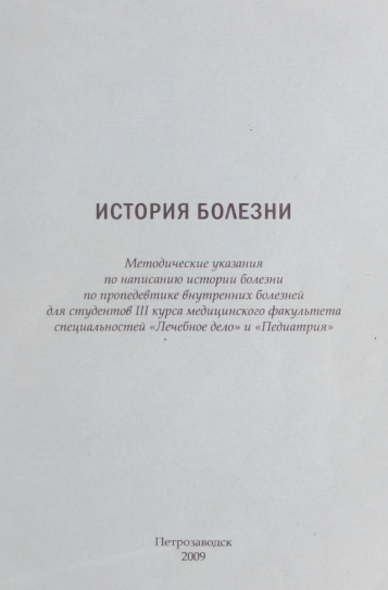 История болезни : метод. указания по написанию истории болезни по пропедевтике внутренних болезней для студентов III курса мед. фак. специальностей «Лечебное дело» и «Педиатрия» / Гос. образоват. учреждение высш. проф. образования Петрозав. гос. ун-т ; сост. О. П. Дуданова. — Петрозаводск : Изд-во ПетрГУ, 2009. — [42] с. — URL: http://elibrary.petrsu.ru/books/18320 (дата обращения: 05.12.2025)