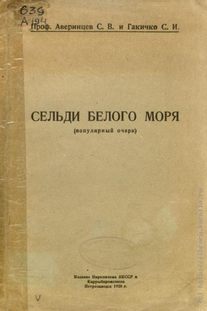 Аверинцев С. В. Сельди Белого моря : (популярный очерк) / Аверинцев С. В. и Гакичко С. И. ; Наркомзем АКССР, Каррыбпромсоюз. — Петрозаводск, 1928. — [29] с. — Копии страниц книги в формате jpg. — URL: http://elibrary.petrsu.ru/books/18621 (дата обращения: 05.12.2025)