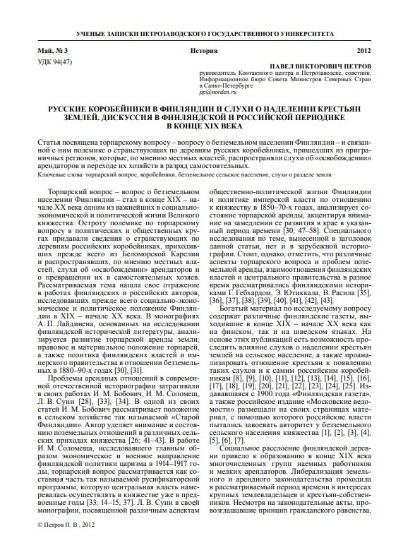 Статья посвящена торпарскому вопросу – вопросу о безземельном населении Финляндии – и связанной с ним полемике о странствующих по деревням русских коробейниках, пришедших из приграничных регионов, которые, по мнению местных властей, распространяли слухи об «освобождении» арендаторов и переходе их хозяйств в разряд самостоятельных.