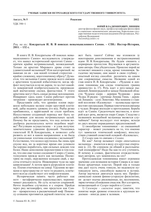 Рец. на кн.: Кондратьев И. В. В поисках невымышленного Сампо. СПб. : Нестор-История, 2011. 132 с.