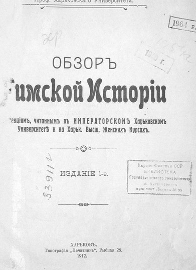 Обзоръ Римской Исторiи : к лекциямъ, читаннымъ въ Императорскомъ Харьковскомъ УниверситетѢ и на Харьковских Высших Женскихъ Курсахъ