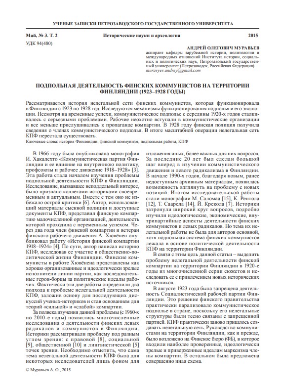 Подпольная деятельность финских коммунистов на территории Финляндии (1923-1928 годы)Сузи Григорий Валерьевич