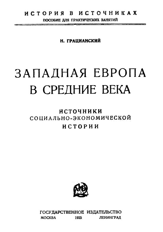 Грацианский Н. П. Западная Европа в Средние века : источники социально-экономической истории / Н. П. Грацианский. — Москва ; Ленинград : Государственное издательство, 1925. — [92] с. — Копии страниц книги в формате pdf. — URL: http://elibrary.petrsu.ru/books/23219 (дата обращения: 05.12.2025)