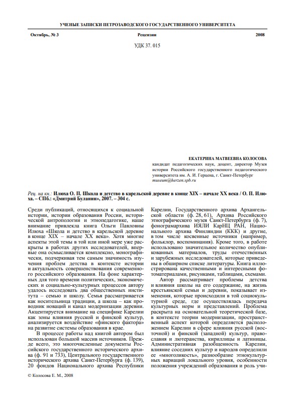 Рец. на кн.: Илюха О. П. Школа и детство в карельской деревне в конце XIX – начале XX века. Санкт-Петербург, 2007. 304 с.