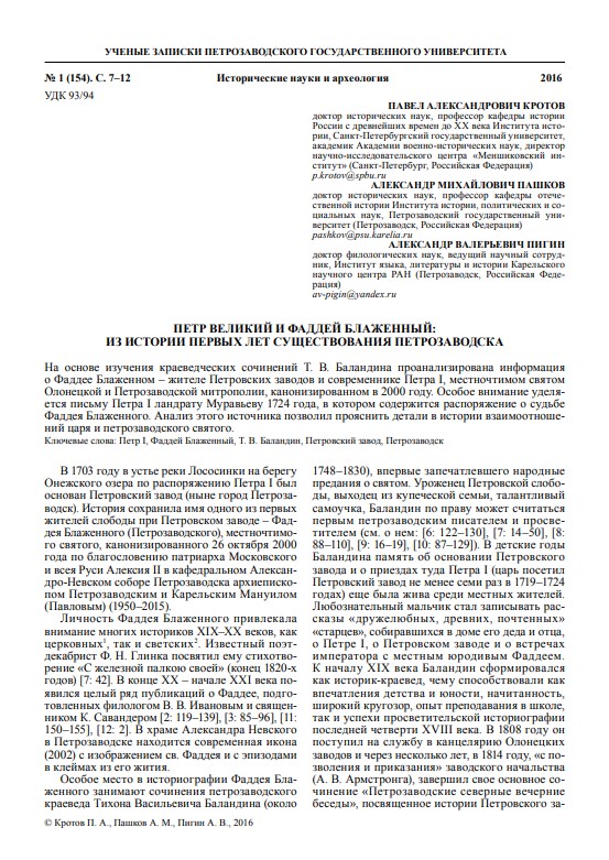 На основе изучения краеведческих сочинений Т. В. Баландина проанализирована информация о Фаддее Блаженном – жителе Петровских заводов и современнике Петра I, местночтимом святом Олонецкой и Петрозаводской метрополии.