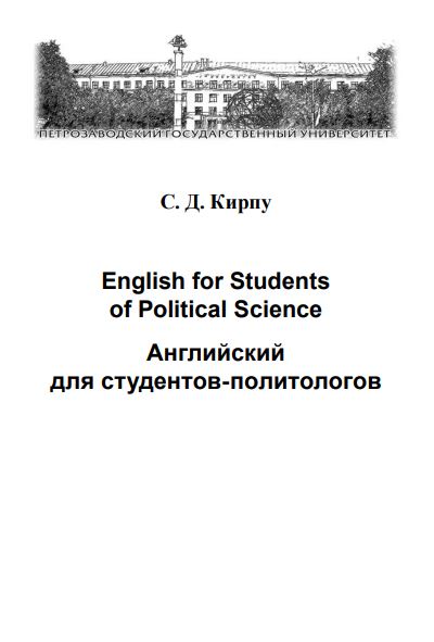 Учебное пособие предназначено для использования на практических занятиях по английскому языку студентами направления подготовки «Политология» (квалификация «бакалавр»). Цель пособия – развитие профессиональных коммуникативных компетенций на материале следующих лексико-семантических тем: 1) основные этапы истории по- литической мысли; 2) основные термины политологии; 3) институты государственной власти; 4) исполнительная власть и политические партии; 5) гражданское участие; 6) ресурсы власти и влияние; 7) национальная идентичность; 8) политические партии; 9) заинтересованные группы; 10) избирательные кампании; 11) проблемы глобализации. Издание содержит упражнения на перевод профессиональной терминологии, а также лексические упражнения, развивающие навыки английского языка в академических целях. В конце пособия приведены цитаты известных философов и политиков, а также большой список интернет-ресурсов. Адресовано всем преподавателям и студентам, которые стремятся совершенствовать свои навыки английского языка.