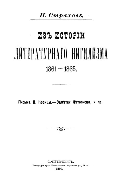 «...Опредѣлить истинный объемъ и истинное значеніе этого явленія не такъ легко. За что его принять? За нѣкоторый фазисъ въ развитіи русской литературы, или за временную заразу, случайно попавшую въ здоровый организмъ и потомъ изгнанную изъ него усиліемъ жизни? Внѣшніе его размѣры очень велики. Какъ бы это насъ ни огорчало, но, кажется, цѣлый періодъ нашей литературы придется назвать нигистическимъ. Именно, больше двадцати лѣтъ, отъ Парижскаго мира до войны за Болгарію, самою господствующею чертою въ нашей литературѣ былъ нигилизмъ въ различныхъ его развитіяхъ. ...» (с. VIII).