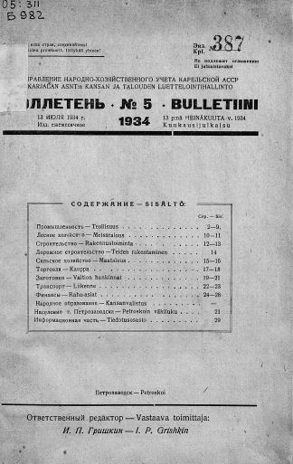 Бюллетень = Bulletiini / Управление народно-хозяйственного учета Карельской АССР ; отв. ред.: И. П. Гришкин. Петрозаводск, 1934. № 5, (13 июля). Выходит ежемесячно.