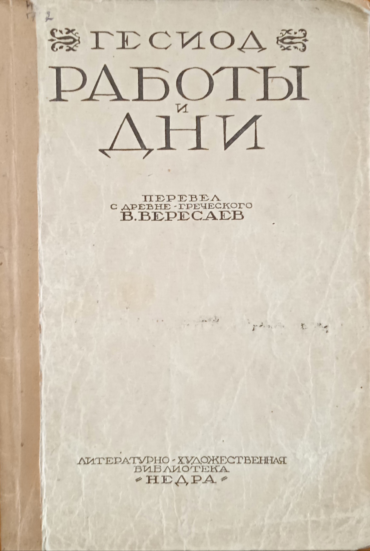 Гесиод. Работы и дни : земледельческая поэма / Гесиод ; перевел с древне-греческого В. Вересаев. Москва : Недра, 1927. 88 с. ; 23 см. (Литературно-художественная библиотека "Недра"). В 1918 г. Государственной академией наук перевод удостоен полной Пушкинской премии. На титульном листе печать «Из книг В. М. Морозова».