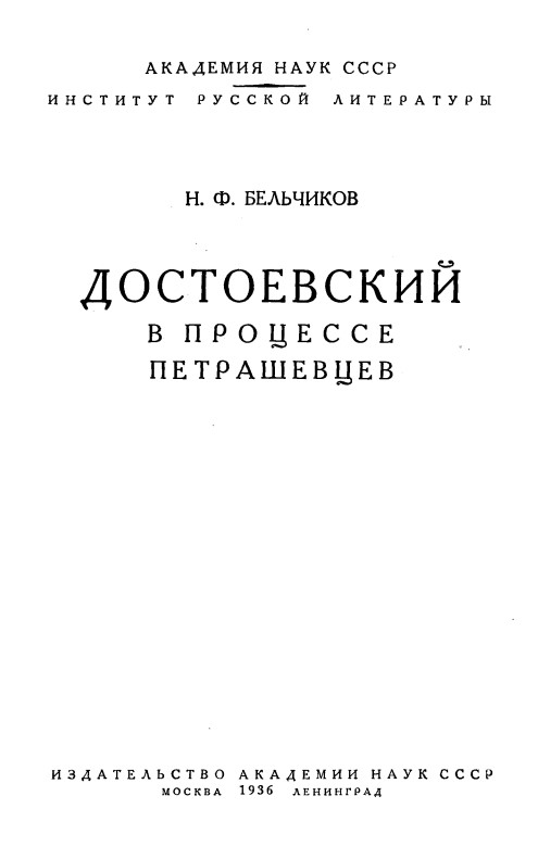Бельчиков Н. Ф. Достоевский в процессе петрашевцев / Н. Ф. Бельчиков ; Акад. наук СССР, Ин-т рус. лит. — Москва ; Ленинград : Изд-во АН СССР, 1936. — [233] с. — Копии страниц книги в формате pdf. — URL: http://elibrary.petrsu.ru/books/28037 (дата обращения: 05.12.2025)