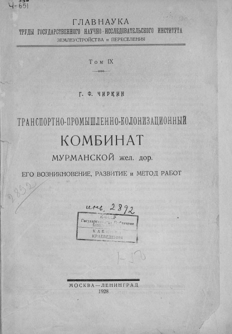 Чиркин, Г. Ф. Транспортно-промышленно-колонизационный комбинат Мурманской железной дороги: его возникновение, развитие и метод работ / Главнаука ; Гос.научно-исследовател. ин-т землеустройства и переселения. М.-Л. : [б. и.], 1928. 135 с. : карты. (Труды гос. научно-исследовательского ин-та землеустройства и переселения. Т. IX).