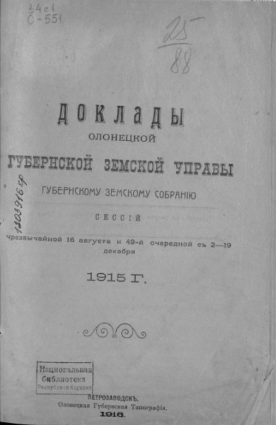 Доклады Олонецкой губернской земской управы губернскому земскому собранию сессий чрезвычайной 16 августа и 49-й очередной с 2–19 декабря 1915 года. — Петрозаводск : Олонецкая губернская типография, 1916. — [536] с. — Копии страниц книги в формате pdf. — URL: http://elibrary.petrsu.ru/books/28837 (дата обращения: 05.12.2025)