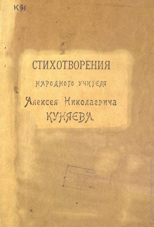 Куняев А.Н. Стихотворения народного учителя Алексей Николаевича Куняева/ Отдел народ. образования при Олон. Губ. И. К-те Советов К., Р. и Кр. Д.- Петрозаводск: Тип. Олонецкого губернского отдела народного образования, 1919.- 61 с.; 22 см.