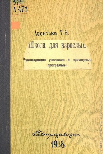 Леонтьев Т. В. Школа для взрослых : Руководящие указания и примерные программы. Петрозаводск : Б. и., 1918. 61 с.