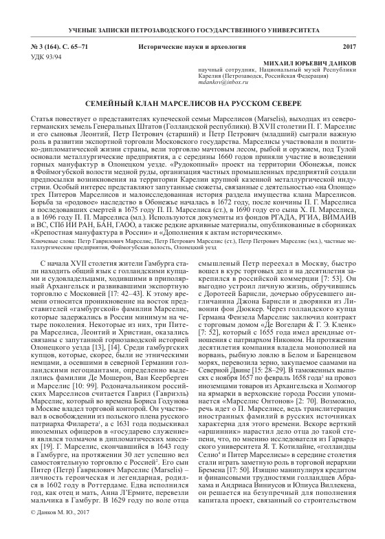 Статья повествует о представителях купеческой семьи Марселисов (Marselis), выходцах из северогерманских земель Генеральных Штатов (Голландской республики). В XVII столетии П. Г. Марселис и его сыновья Леонтий, Петр Петрович (старший) и Петр Петрович (младший) сыграли важную роль в развитии экспортной торговли Московского государства. Марселисы участвовали в политико-дипломатической жизни страны, вели торговлю мачтовым лесом, рыбой и оружием, под Тулой основали металлургические предприятия, а с середины 1660 годов приняли участие в возведении горных мануфактур в Олонецком уезде. «Рудокопный» проект на территории Обонежья, поиск в Фоймогубской волости медной руды, организация частных промышленных предприятий создали предпосылки возникновения на территории Карелии крупной казенной металлургической индустрии...