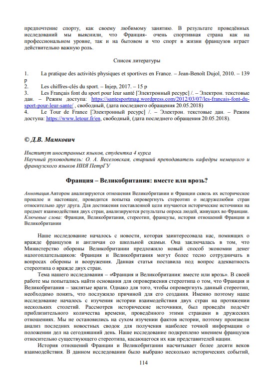Мамкович Д. В. Франция – Великобритания: вместе или врозь? [Электронный ресурс] / Д. В. Мамкович // Научно-исследовательская работа обучающихся и молодых ученых : материалы 70-й Всероссийской (с международным участием) науч. конф. обучающихся и молодых ученых. — Электрон. ст. — Петрозаводск : Изд-во ПетрГУ, 2018. — С. 114-117. — URL: http://elibrary.petrsu.ru/books/30677 (дата обращения: 19.12.2025)