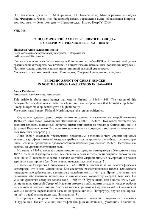 Эпидемический аспект «великого голода» в Северном Приладожье в 1866–1868 гг.