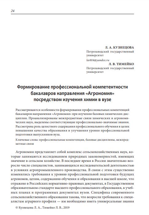 Формирование профессиональной компетентности бакалавров направления «Агрономия» посредством изучения химии в вузеЧаженгина Елена Алексеевна, Ханина Елена Яковлевна