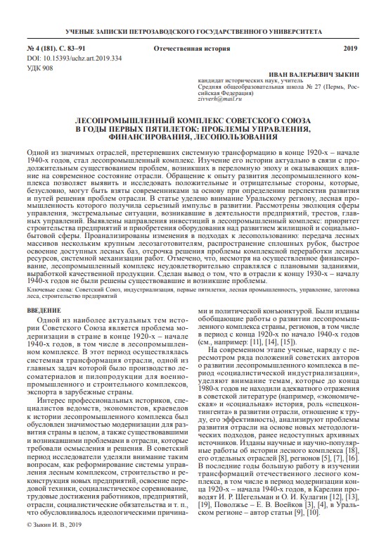 Одной из значимых отраслей, претерпевших системную трансформацию в конце 1920-х – начале 1940-х годов, стал лесопромышленный комплекс. Изучение его истории актуально в связи с продолжительным существованием проблем, возникших в переломную эпоху и оказывающих влияние на современное состояние отрасли. Обращение к опыту развития лесопромышленного комплекса позволяет выявить и исследовать положительные и отрицательные стороны, которые, безусловно, могут быть взяты современниками за основу при определении перспектив развития и путей решения проблем отрасли. В статье уделено внимание Уральскому региону, лесная промышленность которого получила серьезный импульс в развитии.