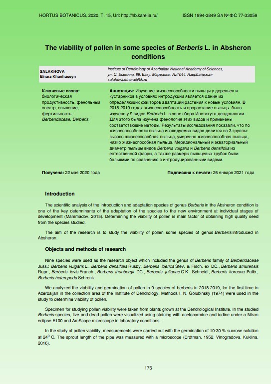 The viability of pollen in some species of Berberis L. in Absheron conditionsЕрмаков Максим Александрович, Волкова Ольга Дмитриевна, Хоциалова Лидия Игоревна, Салтыкова Анастасия Михайловна