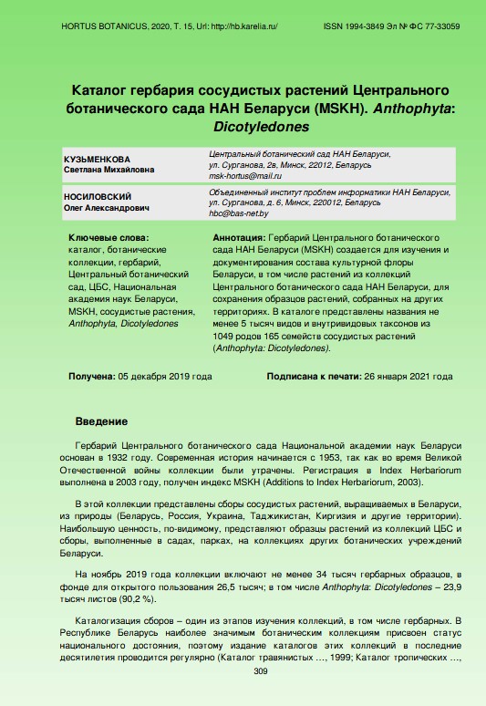Гербарий Центрального ботанического сада НАН Беларуси (MSKH) создается для изучения и документирования состава культурной флоры Белоруссии, в том числе растений из коллекций Центрального ботанического сада НАН Беларуси, для сохранения образцов растений, собранных на других территориях. В каталоге представлены названия не менее 5 тысяч видов и внутривидовых таксонов из 1049 родов 165 семейств сосудистых растений (Anthophyta: Dicotyledones).
