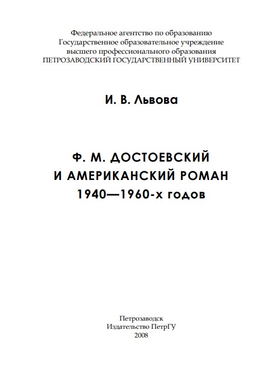 Львова И. В. Ф. М. Достоевский и американский роман 1940–1960-х годов : монография / И. В. Львова/ — Петрозаводск : Изд-во ПетрГУ, 2008. — [311] с. — URL: http://elibrary.petrsu.ru/books/5191 (дата обращения: 05.12.2025)