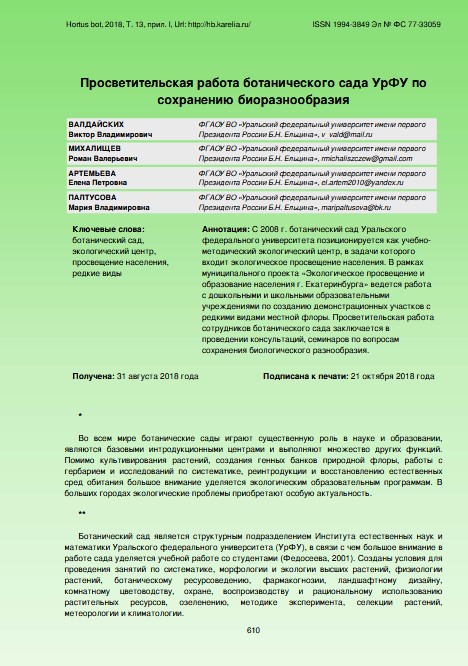 Просветительская работа ботанического сада УрФУ по сохранению биоразнообразияГонтарь Оксана Борисовна, Зотова Олеся Евгеньевна, Калашникова Ирина Владимировна