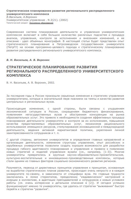 Современная система планирования деятельности и управления университетским комплексом включает в себя большое количество различных подсистем и процедур анализа, управления, контроля за исполнением и внесением изменений, и ее описание – удел объемных монографий. В настоящей статье представлен опыт стратегического планирования в Петрозаводском государственном университете (ПетрГУ) на основе программно-целевого подхода к стратегическому планированию развития распределенного регионального университетского комплекса.