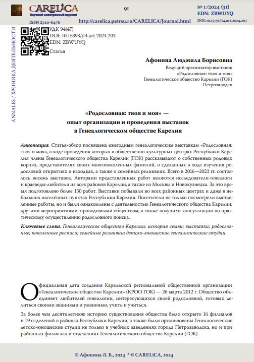 Статья-обзор посвящена ежегодным генеалогическим выставкам «Родословная: твоя и моя», в ходе проведения которых в общественно-культурных центрах Республики Карелия члены Генеалогического общества Карелии (ГОК) рассказывают о собственных родовых корнях, представителях своих многопоколенных фамилий, о сделанных в ходе изучения родословий открытиях и находках, а также о семейных реликвиях. Всего в 2016–2023 гг. состоялось восемь выставок. Авторами представленных работ являются исследователи-генеалоги и краеведы-любители из всех районов Карелии, а также из Москвы и Новокузнецка. За это время подготовлено более 150 работ. Выставки побывали во всех районных центрах и даже в небольших населённых пунктах Республики Карелия. Посетители не только посмотрели выставленные работы, но и были ознакомлены с деятельностью Генеалогического общества Карелии: другими мероприятиями, проводимыми обществом, а также получили консультации по практическому осуществлению родословного поиска.