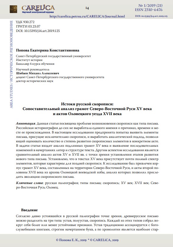 Данная статья посвящена проблеме возникновения скорописи как типа письма. Российская историография до сих не выработала единого мнения о причинах, времени и месте её происхождения. В настоящем исследовании предпринята попытка выявить элементы письма, присущие исключительно скорописи, и выработать аналитический подход, позволяющий оценивать количество и степень развития скорописных элементов в конкретном акте. В задачи статьи входит анализ подлинных грамот XV века и выявление последовательных изменений в начертаниях литер и структуре текста. Другим аспектом исследования является сравнительный анализ актов XV и XVII вв. с точки зрения установления этапов развития нового типа письма. Установлено, что в текстах XV века присутствует почти полный спектр элементов, которые характерны для поздней скорописи. К исследованию был привлечен корпус грамот XV века, составленных на территории Северо-Восточной Руси, и акты второй половины XVII века из архива Олонецкой воеводской избы, анализ которых позволил проследить эволюцию скорописного письма.