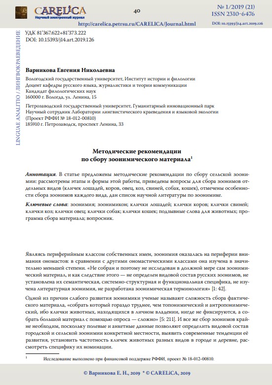 В статье предложены методические рекомендации по сбору сельской зоонимии: рассмотрены этапы и формы этой работы, приведены вопросы для сбора зоонимов отдельных видов (кличек лошадей, коров, овец, коз, свиней, собак, кошек и др.), отмечены особенности сбора зоонимов каждого вида, дан список научной литературы по зоонимике.