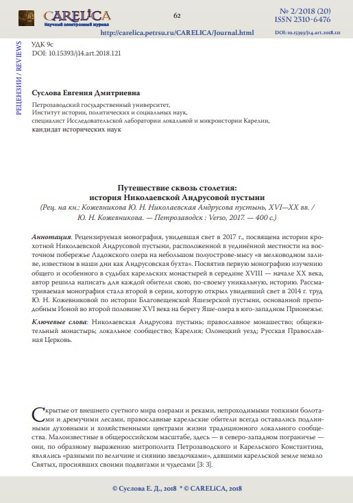Рец. на кн.: Кожевникова Ю. Н. Николаевская Андрусова пустынь, XVI–XX вв. / Ю. Н. Кожевникова. Петрозаводск : Verso, 2017. 400 с.
