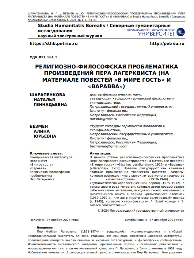 Религиозно-философская проблематика произведений Пера Лагерквиста (на материале повестей «В мире гость» и «Варавва»)