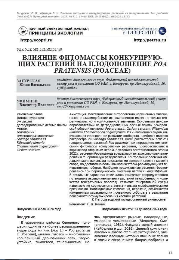 Восстановление антропогенно нарушенных фитоценозов и взаимодействие их компонентов имеет не только теоретическое, но и хозяйственное значение. Основными ценозообразователями на деградированных лесных почвах Кемеровской области являются Poa pratensis, Cirsium setosum, Filipendula ulmaria и Chamaenerion angustifolium. Из инвазионных видов, нарушающих естественное развитие сообществ, наиболее широко распространен Solidago canadensis. Нами рассмотрены аспекты плодоношения растений Poa pratensis при периодическом внесении фитомассы конкурентных растений, произрастающих в ящиках под открытым небом. В условиях вегетационного сезона 2022 г. растения Poa pratensis во всех вариантах эксперимента перешли в генеративную фазу развития. Контрольные растения обладали минимальными показателями зрелости семян в момент сбора, но достаточно большим количеством формирующихся генеративных побегов. Наиболее продуктивные растения формировались при периодическом внесении частей C. angustifolium. В остальных вариантах отмечалось снижение репродуктивного потенциала экспериментальных растений (в особенности количества генеративных побегов). Развитие генеративной сферы напрямую не соотносится с вегетативными морфологическими признаками. Наблюдаемые изменения, вероятно, объясняются изменением характеристик почвенного субстрата в результате поверхностного мульчирования частями растений.