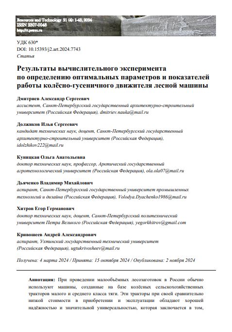 При проведении малообъёмных лесозаготовок в России обычно используют машины, созданные на базе колёсных сельскохозяйственных тракторов малого и среднего класса тяги. Эти тракторы при своей сравнительно низкой стоимости в приобретении и эксплуатации обладают хорошей надёжностью и значительной универсальностью, которая заключается в том, что их можно использовать не только на лесосечных и лесохозяйственных работах, но и для коммунального хозяйства, и собственно сельскохозяйственных работ, что обеспечивает их круглогодичную эффективную эксплуатацию. Однако при работе в сложных условиях – на глубоком снеге, при слабонесущих почвогрунтах, на подъёмах таким тракторам не хватает тягового усилия. В этой связи в сельскохозяйственном производстве разработан и успешно используется достаточно простой способ перевода колёсных тракторов на полугусеничный ход. Это обеспечивает существенное увеличение их проходимости в сложных условиях эксплуатации, повышение силы тяги и существенную экономию топлива. В данной статье представлены результаты вычислительного эксперимента, в задачи которого входило (на основании ранее разработанной и исследованной математической модели обоснования оптимальных параметров колёсно-гусеничного движителя лесной машины) определить оценку глубины образующейся колеи, тягово-сцепных свойств движителя и требуемой мощности при заданных свойствах почвогрунта и варьировании нагрузки со стороны колёсного и гусеничного движителя.