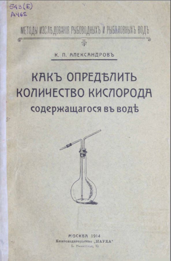 Как определить количество кислорода, содержащегося в воде : (метод Винклера) : общедоступное практическое руководство для ихтиологов, рыбоводов, аквариумистов и натуралистов-любителей : с 24 рисунками / сост. К. П. Александров. — Москва : Наука, 1914. — [72] с. — (Методы исследования рыбоводных и рыболовных вод). — Копии страниц в формате pdf. — URL: http://elibrary.petrsu.ru/books/76484 (дата обращения: 05.12.2025)