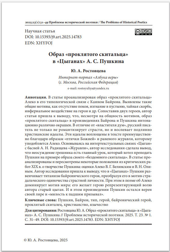 В статье проанализирован образ «проклятого скитальца» Алеко в его типологической связи с Каином Байрона.