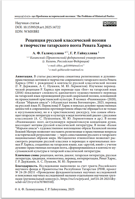 В статье рассмотрена семантика религиозных и духовнонравственных мотивов в творчестве современного татарского поэта Рената Хариса (1941 г. рождения) в контексте русской классической поэзии (Г. Р. Державин, А. С. Пушкин, М. Ю. Лермонтов).