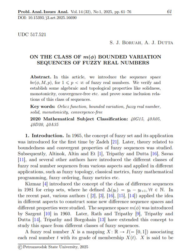В этой статье вводится пространство последовательностей bv (ф, М, р) для 1⩽ р < ∞ нечетких действительных чисел. В данной работе проверяются и устанавливаются некоторые алгебраические и топологические свойства, такие как прочность, монотонность, отсутствие сходимости и т.д., и доказываются некоторые соотношения включения этого класса последовательностей.