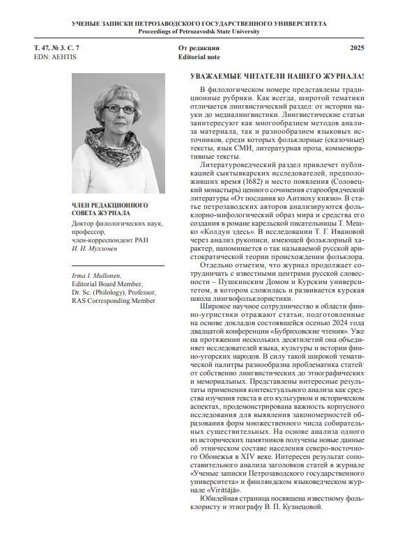 В филологическом номере представлены традиционные рубрики. Как всегда, широтой тематики отличается лингвистический раздел: от истории науки до медиалингвистики. Лингвистические статьи заинтересуют как многообразием методов анализа материала, так и разнообразием языковых источников, среди которых фольклорные (сказочные) тексты, язык СМИ, литературная проза, коммеморативные тексты