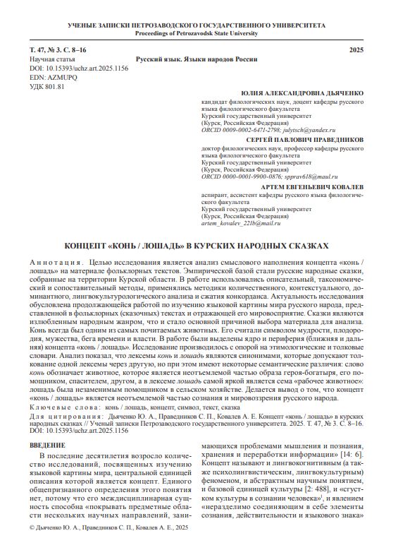 Целью исследования является анализ смыслового наполнения концепта «конь / лошадь» на материале фольклорных текстов. Эмпирической базой стали русские народные сказки, собранные на территории Курской области. В работе использовались описательный, таксономический и сопоставительный методы, применялись методики количественного, контекстуального, доминантного, лингвокультурологического анализа и сжатия конкорданса.