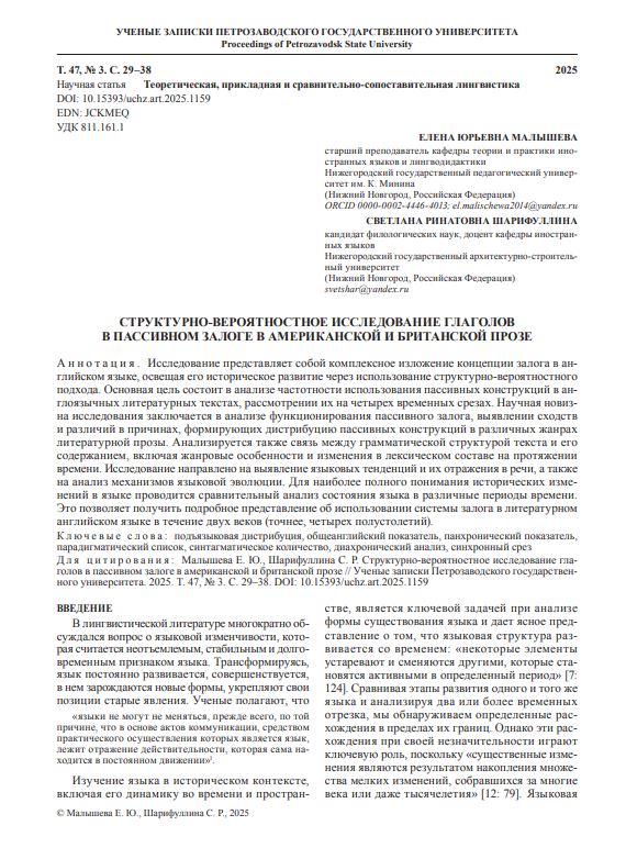 Исследование представляет собой комплексное изложение концепции залога в английском языке, освещая его историческое развитие через использование структурно-вероятностного подхода. Основная цель состоит в анализе частотности использования пассивных конструкций в англоязычных литературных текстах, рассмотрении их на четырех временных срезах. Научная новизна исследования заключается в анализе функционирования пассивного залога, выявлении сходств и различий в причинах, формирующих дистрибуцию пассивных конструкций в различных жанрах литературной прозы.