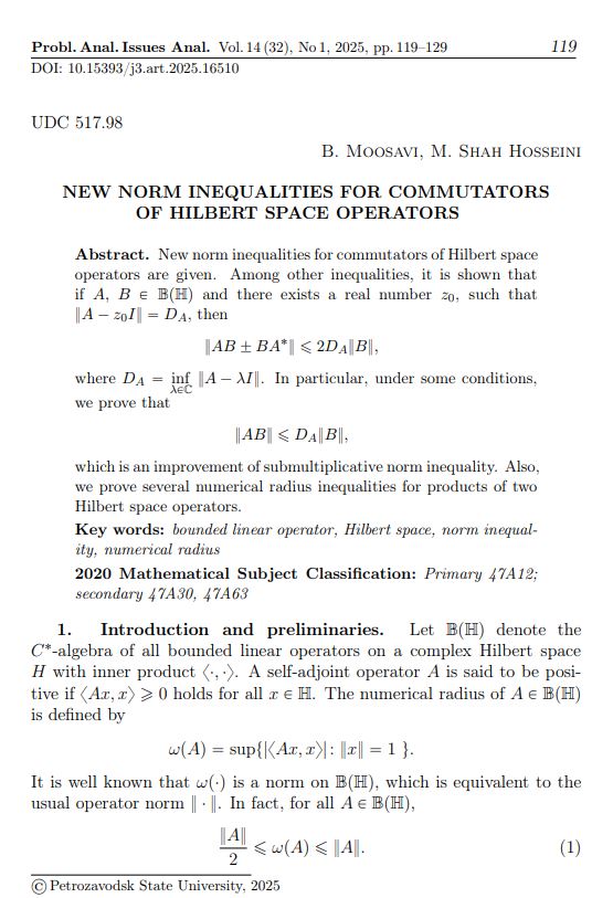 В данной работе даны новые нормальные неравенства для коммутаторов операторов Hilbert пространства. Среди прочих неравенств показано, что если А, В ∈ В (Н) и существует действительное число z0, такое, что ll A-z0I ll = DA, тогда ll AB±BA* ll ⩽ 2DA ll B ll, где DA= infλ∈C ll А - λI ll. В частности, при некоторых условиях, доказано, что ll AB ll ⩽ DA ll B ll, что является улучшением неравенства субмультипликативной нормы. Кроме того, доказано несколько численных неравенств радиуса для произведений двух операторов Hilbert пространства.